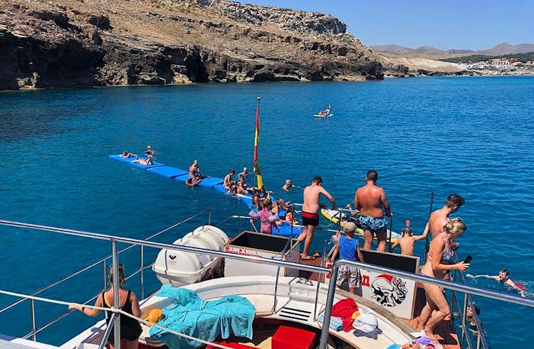 A continuación, el capitán fondeará para que pueda refrescarse nadando y haciendo snorkel, o simplemente quedarse a bordo escuchando música y tomando el sol. También hay aperitivos incluidos para que no tenga que preocuparse por pasar hambre mientras está en el agua - padres, no se preocupen, también hay opciones para los más quisquillosos.