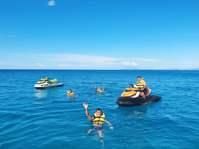 Partiendo del puerto de Cala Gamba, súbete a tu moto acuática y viaja hasta Cap Rocat y la reserva natural protegida de Los Deltas.