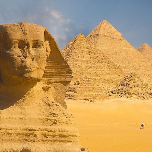 Visita las Grandes Pirámides de Guiza: Keops, Kefrén y Mykerinos. Explora el Templo del Valle, donde los antiguos sacerdotes momificaron al rey Kefrén. Contempla la Esfinge, un guardián legendario con cuerpo de león y la cabeza del rey Kefrén.