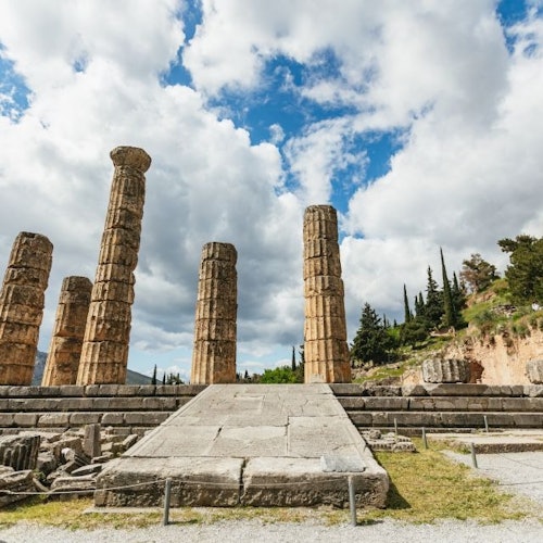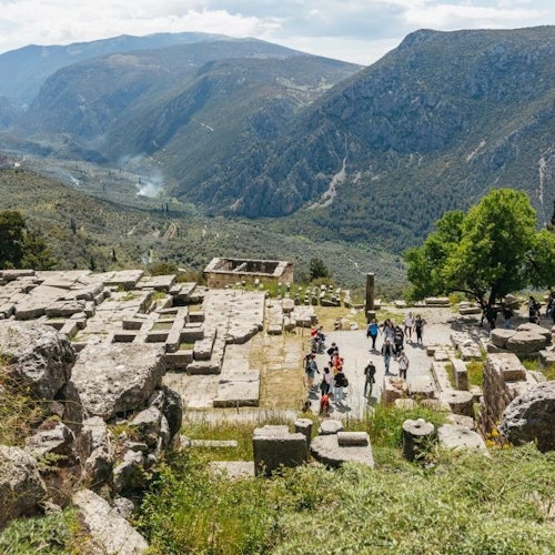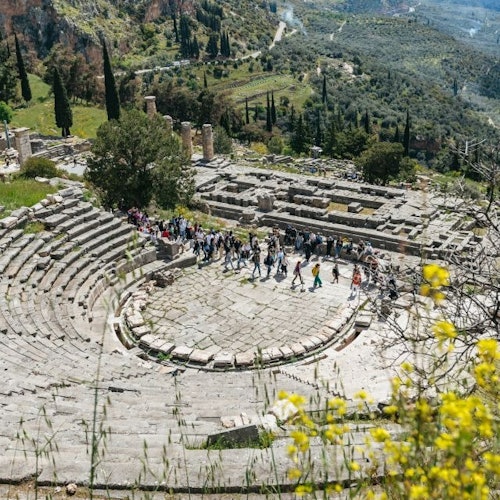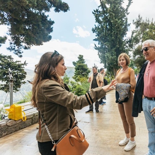 Únete a una excursión desde Atenas para visitar Delfos, Patrimonio de la Humanidad de la UNESCO. Reúnete con el guía en la estación de metro de Halandri. Sube al autobús y dirígete hacia la cordillera del Parnaso y las rocas Fedriades.