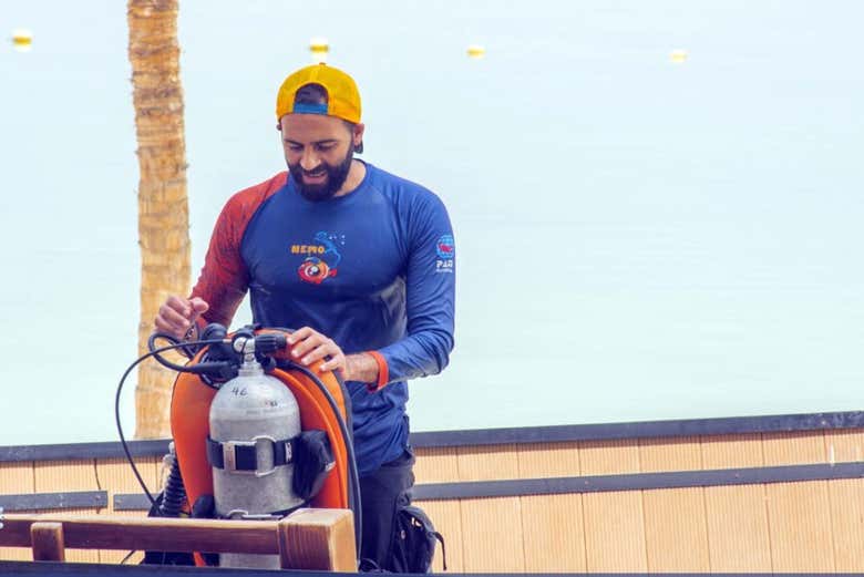 Después de esta introducción teórica, pasaremos a la práctica. Os ayudaremos a poner el equipo de buceo y juntos nos sumergiremos en las profundidades marinas de Dibba Al-Fujairah. La inmersión alcanzará hasta 10 metros de profundidad, permitiéndonos disfrutar de los hermosos arrecifes del mar Arábigo, repletos de coloridos peces y tortugas. ¡Una experiencia realmente impactante!