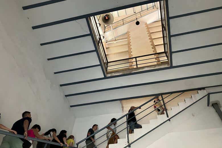 Después de comer, el ascenso será hasta los 65 metros de altura. Una vez arriba, iniciaremos el popular circuito Mirador 360°, un recorrido exclusivo por los rincones inéditos en lo más alto de la edificación. Además de visitar la galería A Giorno, accederemos al campanario, hogar de 20 campanas. Allí, os contaremos su historia mientras vemos la maquinaria original que regula los relojes y las hace funcionar.