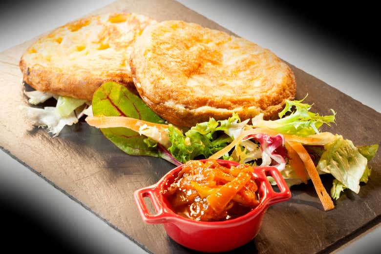 - Tortilla española con cebolla caramelizada.