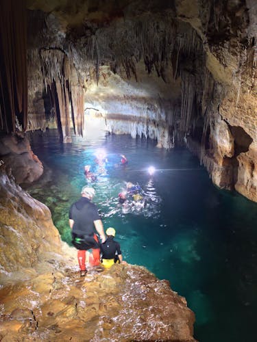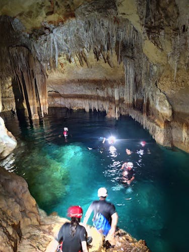 Dentro de la cueva, aprenderás sobre las formaciones cavernarias. Observa cómo el movimiento del agua influye en la formación y el contenido mineral de las estalagmitas. Admira la variedad de llamativos colores rojos que brillan como diamantes en las paredes de este laberinto subterráneo. Pasarás aproximadamente 45 minutos explorando la cueva antes de regresar a la playa.