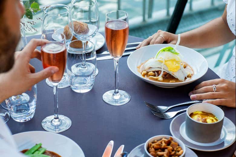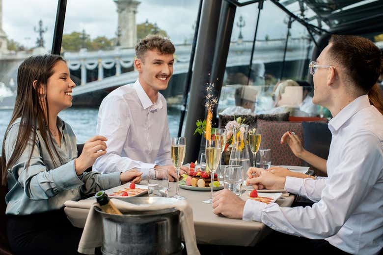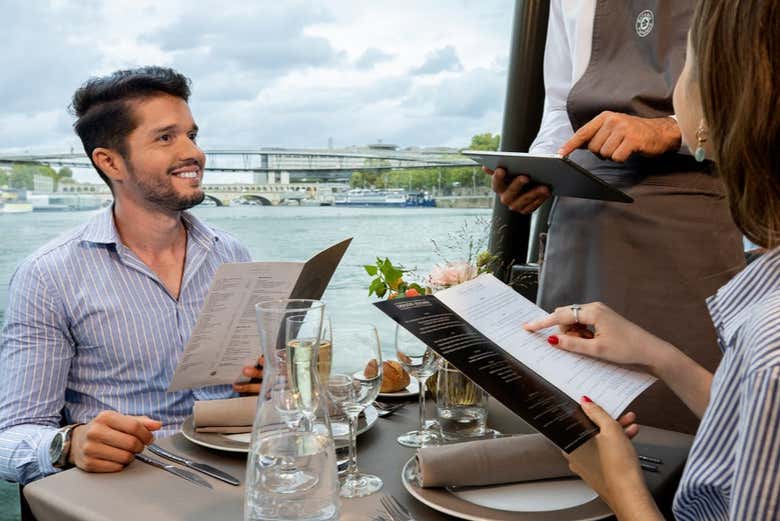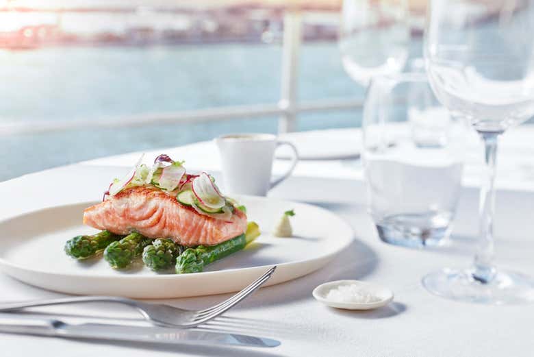 Con esta modalidad, dispondréis de un asiento en el centro del crucero y un menú de tres platos (entrante, plato principal y postre), con bebidas incluidas: una copa de Kir Royale, vino, agua, té o café.