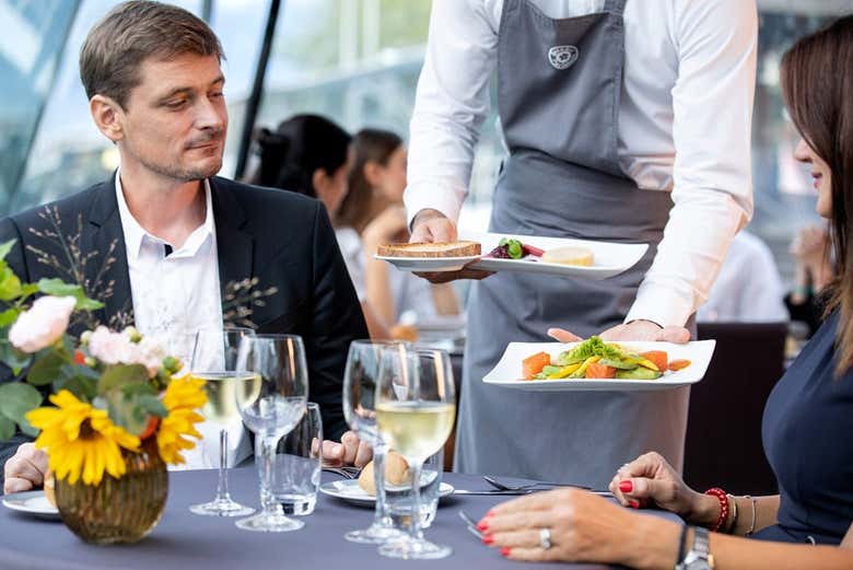 Esta opción incluye un asiento junto a la ventana y un menú de cuatro platos (entrante, plato principal, plato de queso y postre) con bebidas incluidas.