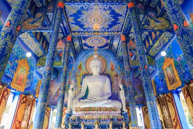 La primera parada de nuestra ruta será Wat Rong Suea Ten, el conocido como Templo Azul. ¡Las tonalidades azuladas de esta increíble construcción os sorprenderán! Accederemos a su interior para contemplar la estatua de buda de más de seis metros de altura que corona la estancia principal.