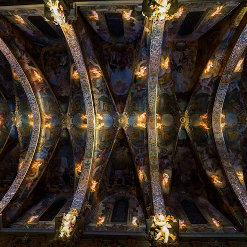 La Iglesia de San Nicolás de Valencia, conocida como la Capilla Sixtina valenciana, es famosa por sus sorprendentes techos pintados al fresco y su altar dorado, que muestran siglos de historia y arte.