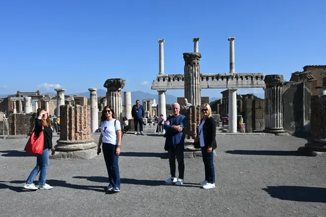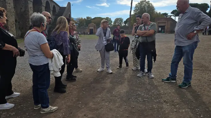 Oggi vi porterò a Pompei, la città sepolta dal vulcano nel 79 d.C. Partendo da Piazza Esedra o Porta Marina, vedremo tante domus con affreschi e mosaici (le antiche residenze dei ricchi), strade originali (cardini e decumani), le botteghe (Termopoli, fulloniche, panifici), i calchi (corpi delle vittime), le terme (SPA), i teatri, l'anfiteatro (dove combattevano i gladiatori), la palestra (dove i gladiatori si allenavano) e tanto altro.