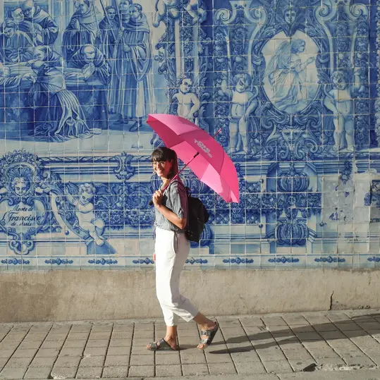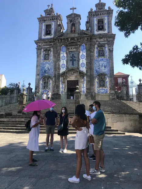 Cerca il nostro ombrello rosa in Praça da Batalha, accanto alla chiesa di San Ildefonso.