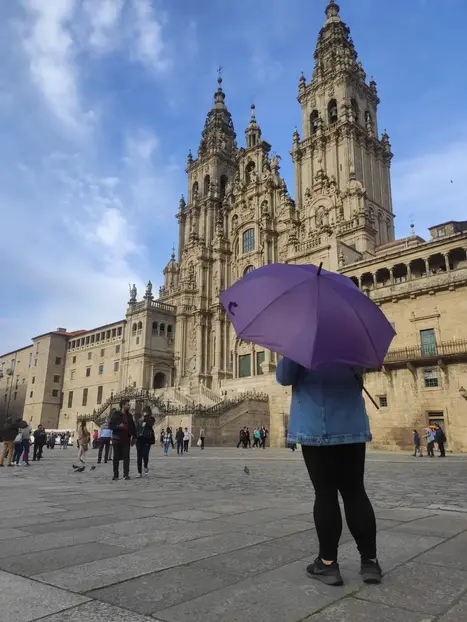 Cerca un OMBRELLO VIOLA all'INGRESSO del Museo della Cattedrale di Santiago situato in Plaza del Obradoiro.