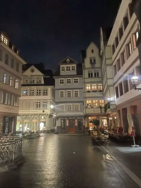 Da lì, ci dirigiamo verso il fiume Meno, passando davanti alla Chiesa di San Paolo fino al Römerberg, il cuore del centro storico di Francoforte. Lì, ci troveremo di fronte al Duomo di Francoforte prima di attraversare il Meno attraverso l'Eiserner Steg (Ponte di Ferro). Sull'altra sponda del Meno, a Sachsenhausen, il nostro tour si conclude con un tradizionale vino di mele di Francoforte (circa il 5% di alcol) in riva al fiume.