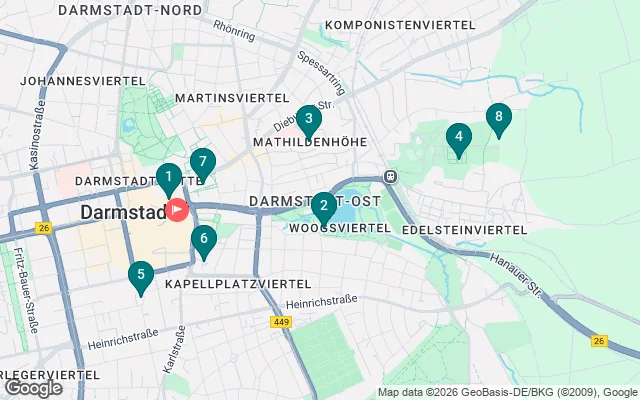 Iniziamo dalla storica piazza del mercato, attraversiamo la bellissima Mathildenhöhe e la vicina Rosenhöhe, scendiamo fino al Woog, il lago balneabile nel centro della città, fino all'imponente St.Ludwigskirche e infine al vivace punto centrale del centro città : Luisenplatz.