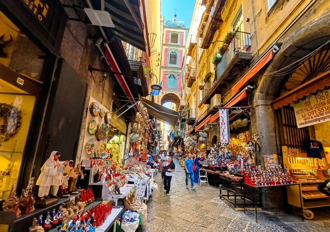 Passeremo sotto lo sguardo del Corpo di Napoli a Sant'Angelo a Nilo, il Dio barbuto che veglia sulla città, per poi attraversare San Gregorio Armeno, dove le statuine sembrano mutare posizione non appena distogli lo sguardo.
