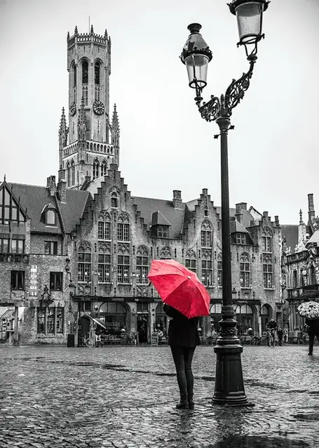 Mercato di Bruges. Cerca l'ombrello viola "Across Bruges".