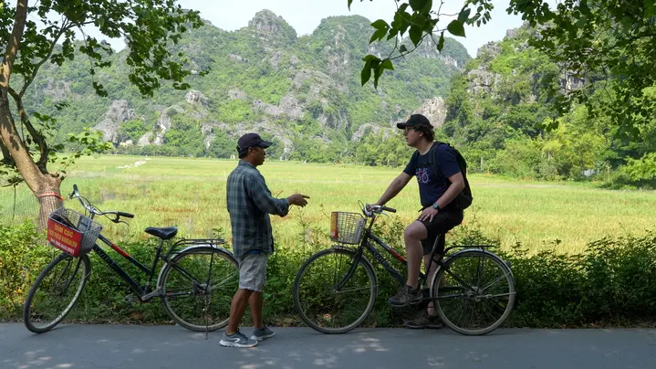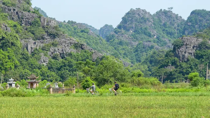 Questo tour guidato in bicicletta di 3 ore ti porta oltre i soliti sentieri turistici, nel profondo della campagna di Ninh Binh, dove le risaie brillano sotto i picchi calcarei e la vita del villaggio scorre tranquilla.