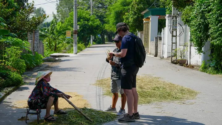 Ci fermiamo a Bich Dong , un'antica pagoda nascosta tra gli alberi, sorseggiamo cocco fresco all'ombra di boschetti e ci immergiamo nel ritmo tranquillo della campagna. Ciò che rende speciale questo tour è il percorso stesso, un anello panoramico che offre qualcosa di nuovo a ogni curva: sentieri lungo il fiume, risaie, vicoli di villaggio e creste calcaree.