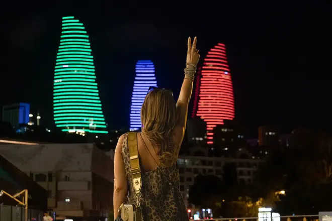 Vista panoramica di Baku, delle Flame Towers e del Mar Caspio.