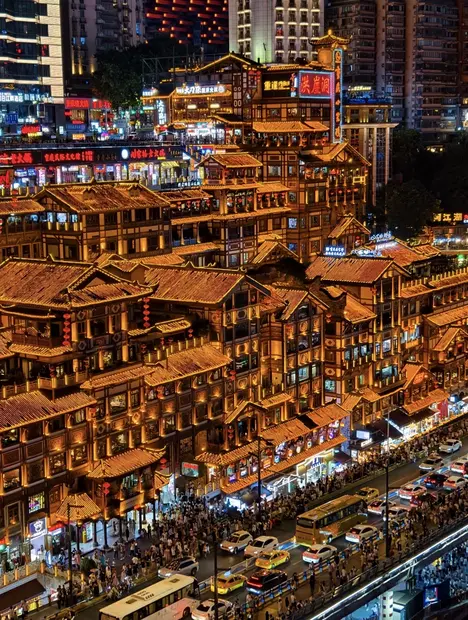 Quando cala la sera, ci dirigeremo verso lo spettacolare Hongyadong, dove le tradizionali case su palafitte si ergono drammaticamente sopra la riva del fiume. Quando le luci si accendono, gli edifici luminosi e i riflessi al neon creano l'iconico skyline cyberpunk che ha reso Chongqing famosa in tutto il mondo.