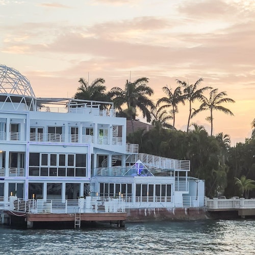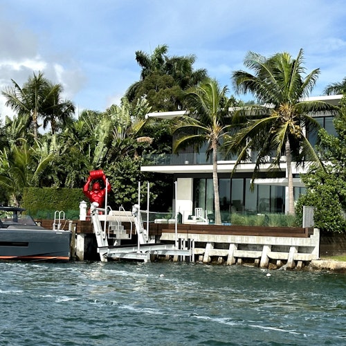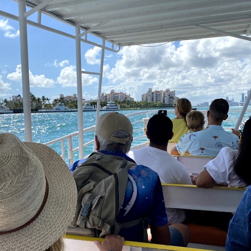 Cruise on a 34-seater catamaran with shaded seating. The bilingual captain navigates around Hibiscus Island, Palm Island, Star Island, Sunset Island, Fisher Island, and the Venetian Islands.