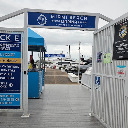 * Enter the Miami Beach Marina near the waterfront side of Monty’s Sunset restaurant. Go through the metal gate marked "Dock E” to the blue octagonal building, where the Water Taxi boat will pick you up