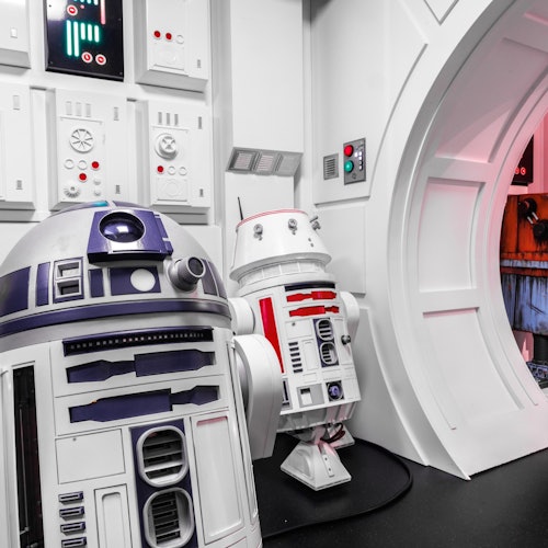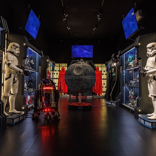 Explore the two-floor exhibition, featuring detailed movie locations, working droids, attachable stormtrooper helmets, Jedi capes, and lightsabers.