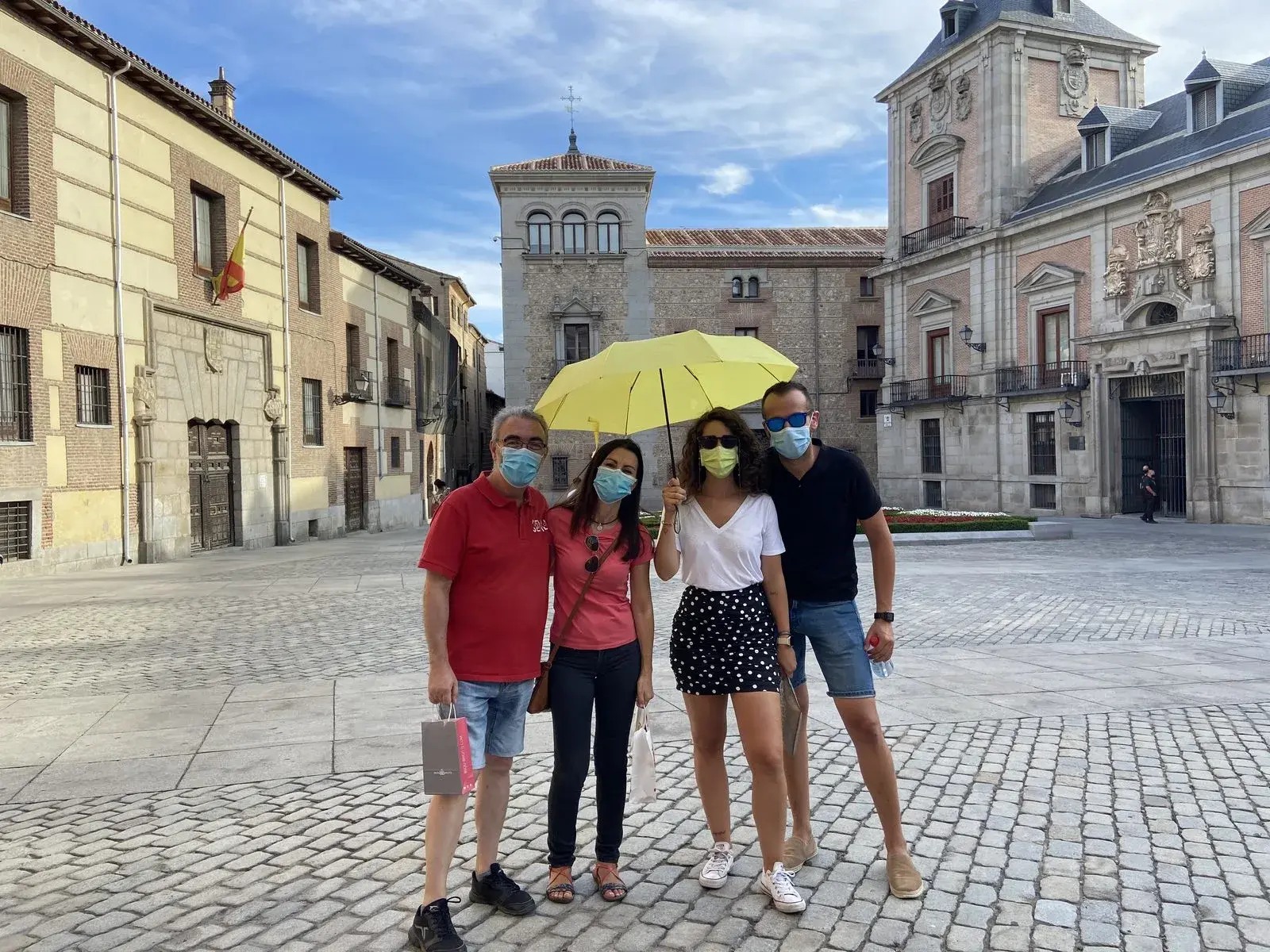 In front of the statue of Carlos III in Puerta del Sol. AMARILLO umbrella