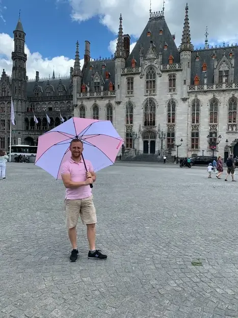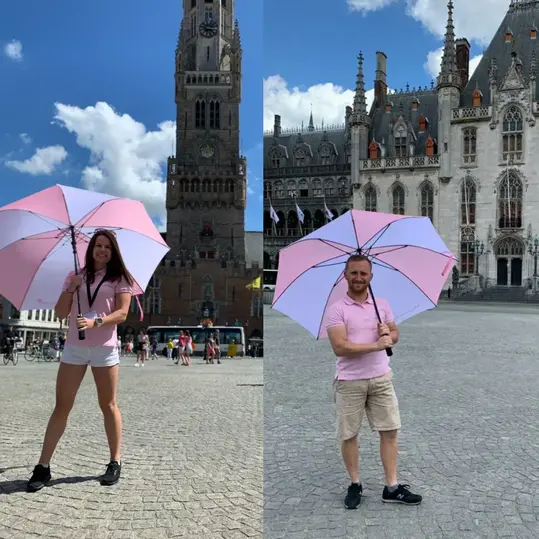 In front of the Belfort tower with a big pink and white umbrella
