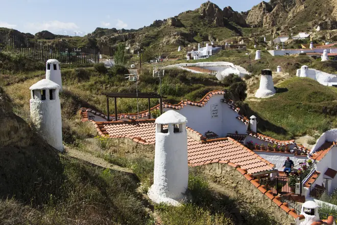 The desolate geography of the Bad-lands to the south and east of Guadix has given rise to the troglodyte habitat , an interesting popular architecture, and this type of subterranean dwelling (more than 2,500) has shaped a very peculiar landscape, of innumerable brown mounds. and reddish, cut like cheese by white planes and dotted by conical chimneys, also white.
