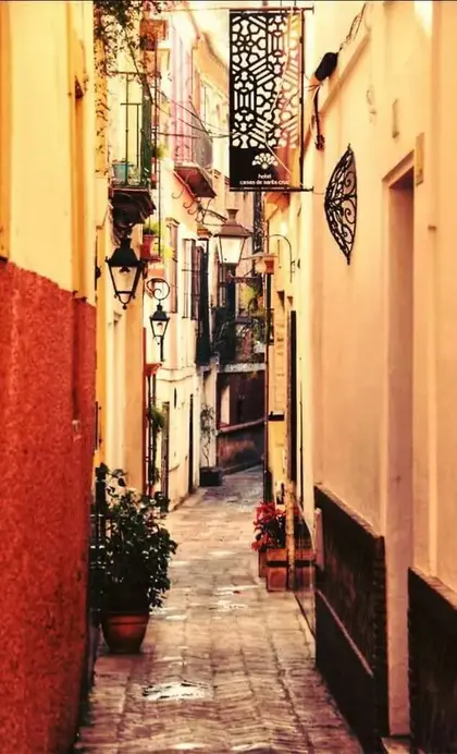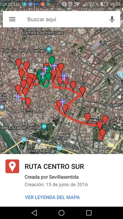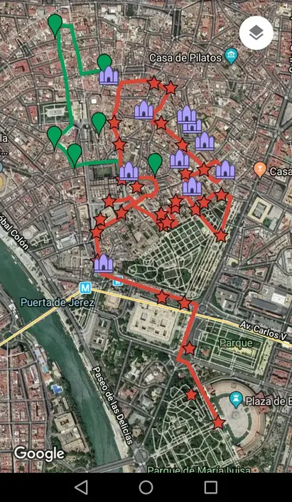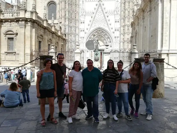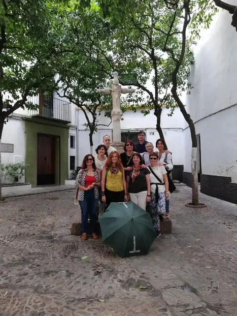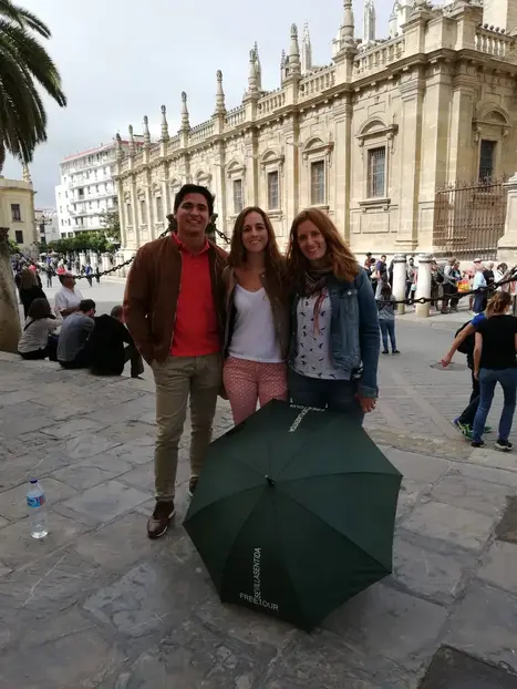 GROUPS OF 15 people max. Our great guide is called ANA. 3 hr route A long journey to not miss any corner, history and legend of Seville. We will start walking through the beautiful Plaza de España, explaining its symbology, we will go in search of our Barrio de Santa Cruz where we will talk about stories and legends that it encloses and on the way around it; ending our walk at the Prince's Gate of the largest Gothic Cathedral in the world. At the end, using google maps, we will give another tourist route and two tapas routes; places that our grandparents enjoyed and today we, where to soak up the idiosyncrasy of our city, so you can enjoy it at your own pace. HERITAGE ROUTE WITHOUT ARCHITECTURAL BARRIERS. We are the ones with the green umbrella.