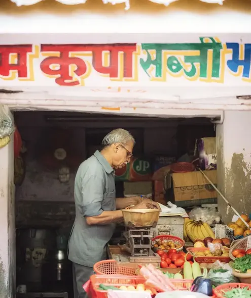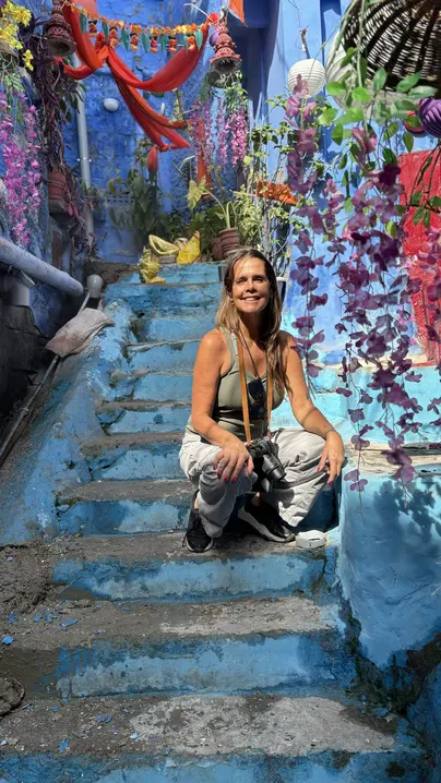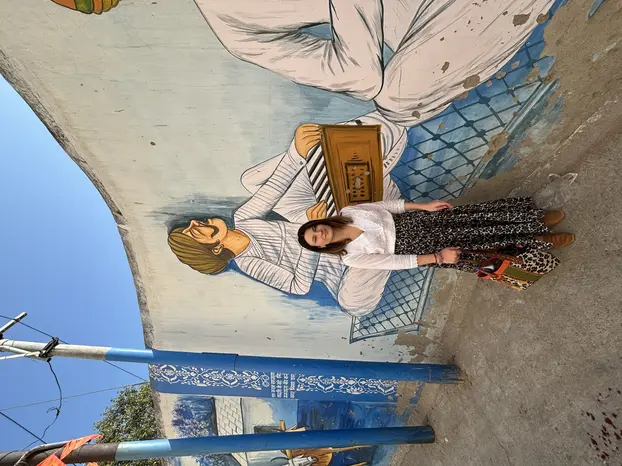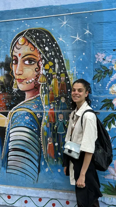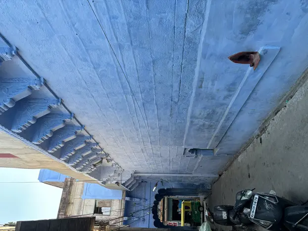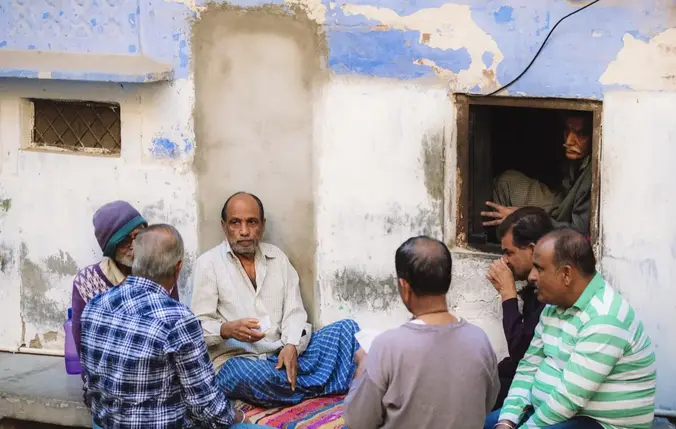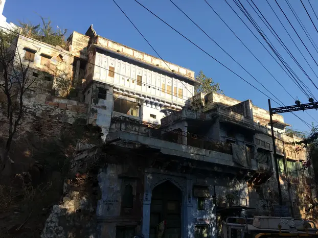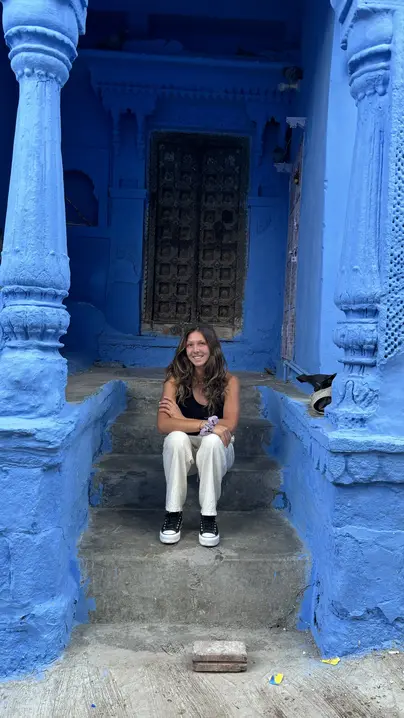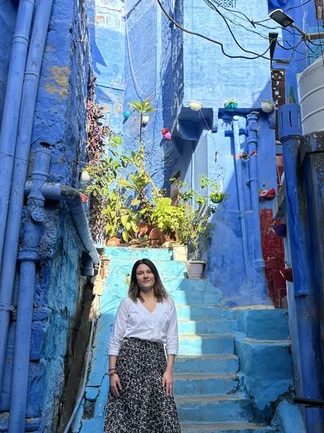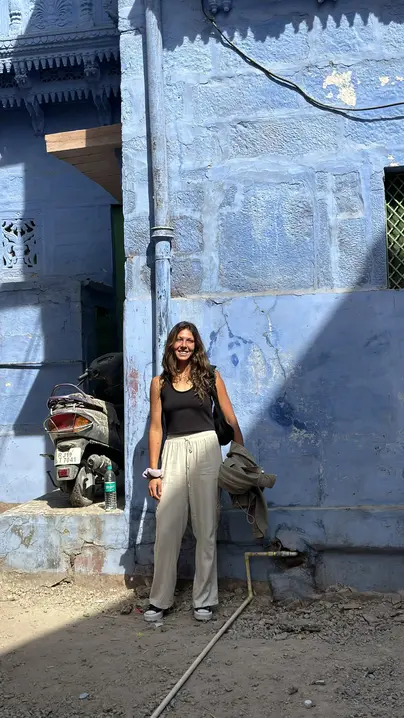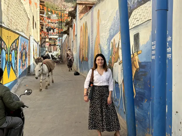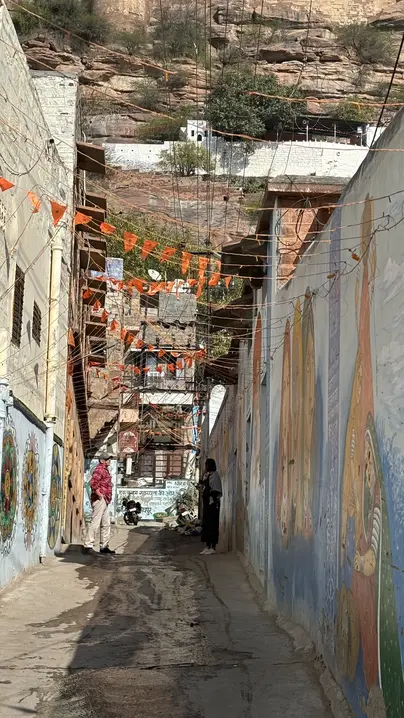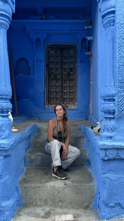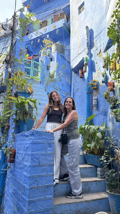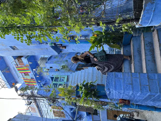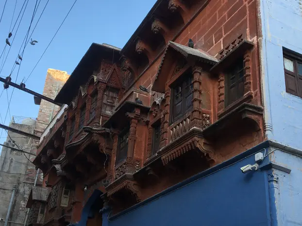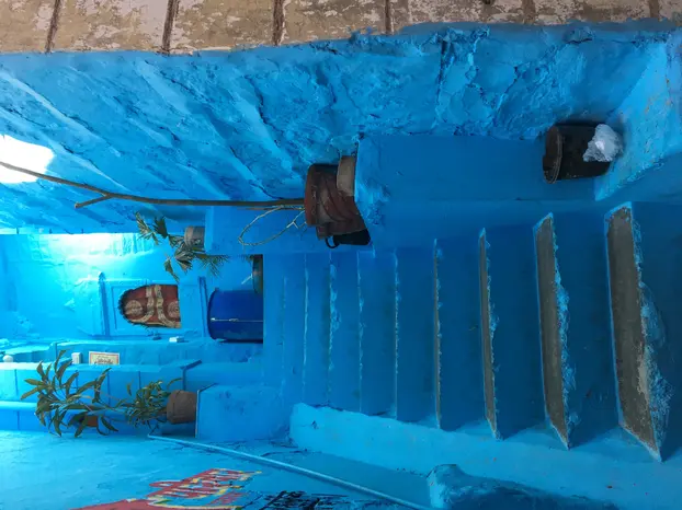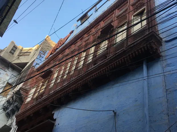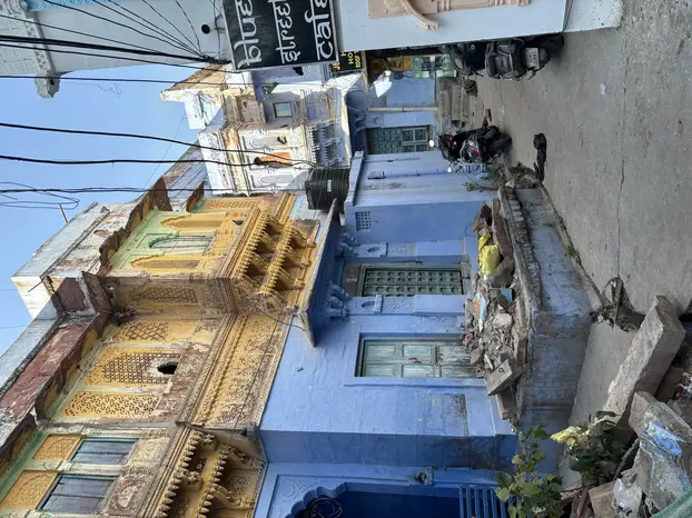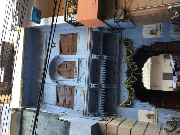 Navchowkiya Will walk to narrow street deep in city to view blue house and market in old city.