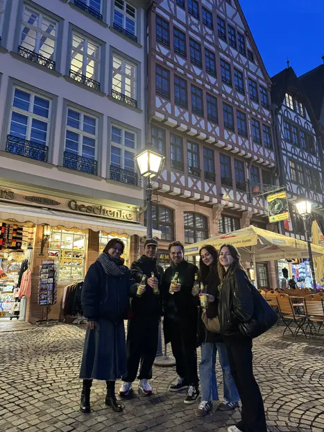 From there, we head towards the Main River, past St. Paul's Church to the Römerberg, the heart of Frankfurt's old town. There, we'll find ourselves in front of Frankfurt Cathedral before crossing the Main via the Eiserner Steg (Iron Bridge). On the other side of the Main, in Sachsenhausen, our tour concludes with a traditional Frankfurt apple wine (approx. 5% alcohol) by the river.