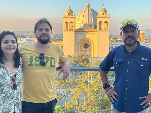 The meeting point is in front of the main door of the Metropolitan Cathedral. I'm wearing a beanie, a scruffy beard and a Columbia T-shirt.