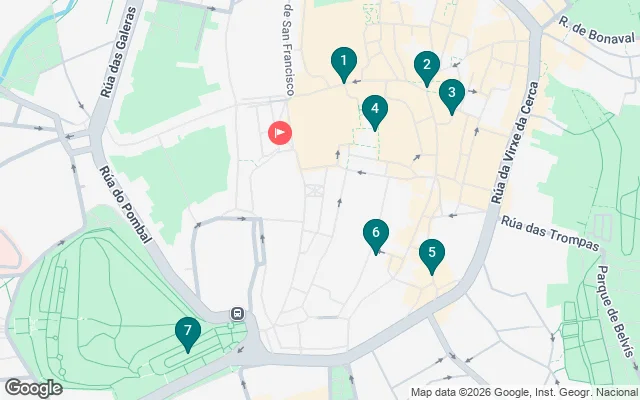 We will cross the arch where the bagpiper usually plays to enjoy the immense monastery of San Martín Pinario, as well as the north façade of the Cathedral. From there we will go to Plaza de la Quintana, Cervantes, Mercado de Abastos, Faculty of Geography and History, Praza Mazarelos and Santa María Salomé, to finish the visit in Alameda Park.