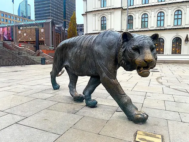 Near the exit of the Jernbanetorget metro station, look for the large bronze sculpture of a TIGER located in the square in front of Oslo Central Station.