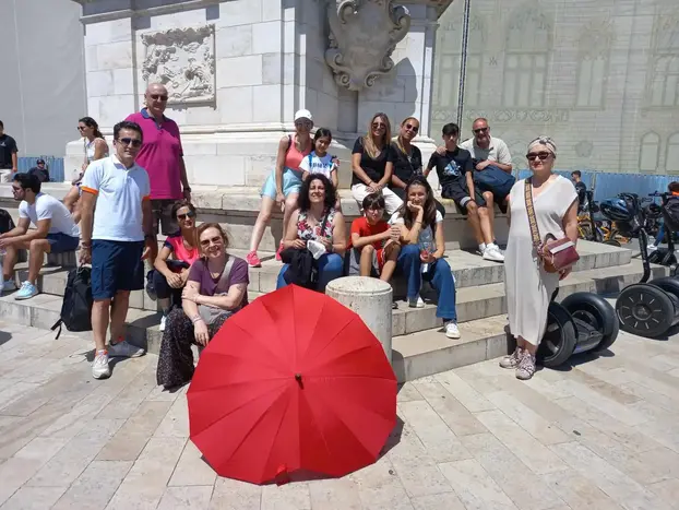 La guida vi aspetta con l'ombrello rosso vicino alla statua di Széll