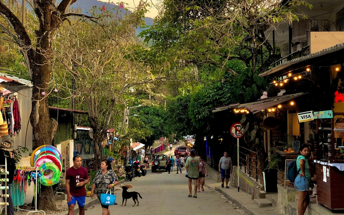 A vibrant thoroughfare filled with colorful shops, crafts, restaurants, and cafes that reflect the local culture and the area's sustainable tourism growth.