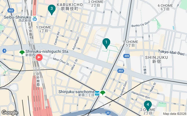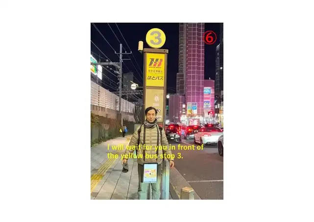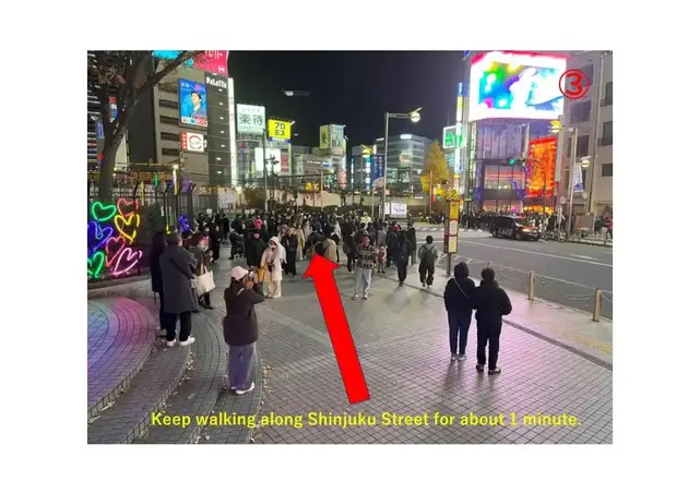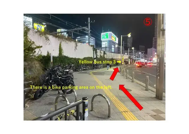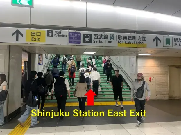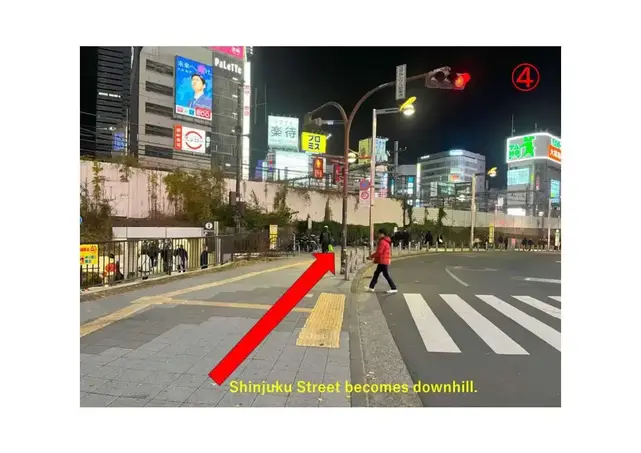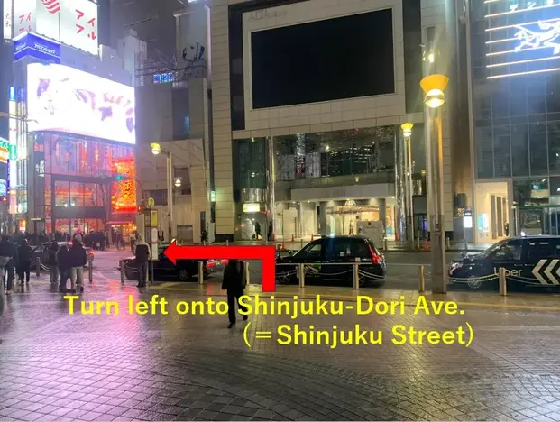 Exit from the Shinjuku Station East Exit, and you will be facing Shinjuku Street ( AKA, Shinjuku Dori Avenue) . Turn left onto Shinjuku Street and walk for about 30 meters (100 feet) . The street will slope downward, and you will see a bike parking area on your left, with a yellow bus stop pole No.3 about 10 meters (30 feet) ahead.