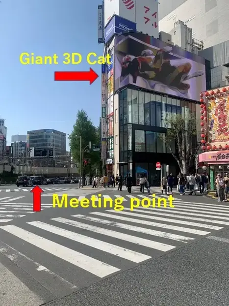 Yellow bus stop Pole No.3 is roughly across the Shinjuku Dori Avenue from The Giant 3D Cat.
