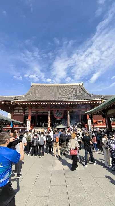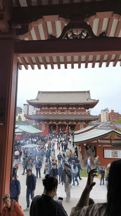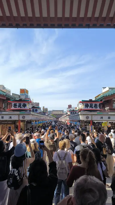 We will continue walking towards the Senso-Ji Temple, starting at the Kaminarinon gate and continuing along the Nakamise shopping street.