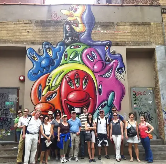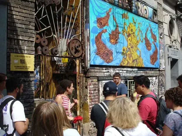 We continue through the bustling neighborhood, passing by trendy boutiques and restaurants that line the streets. Along the way. I'll point out large scale murals by world-famous muralists like Kobra and Jorit.