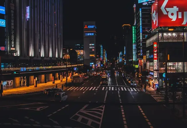 Explore bustling streets full of shops and neon lights