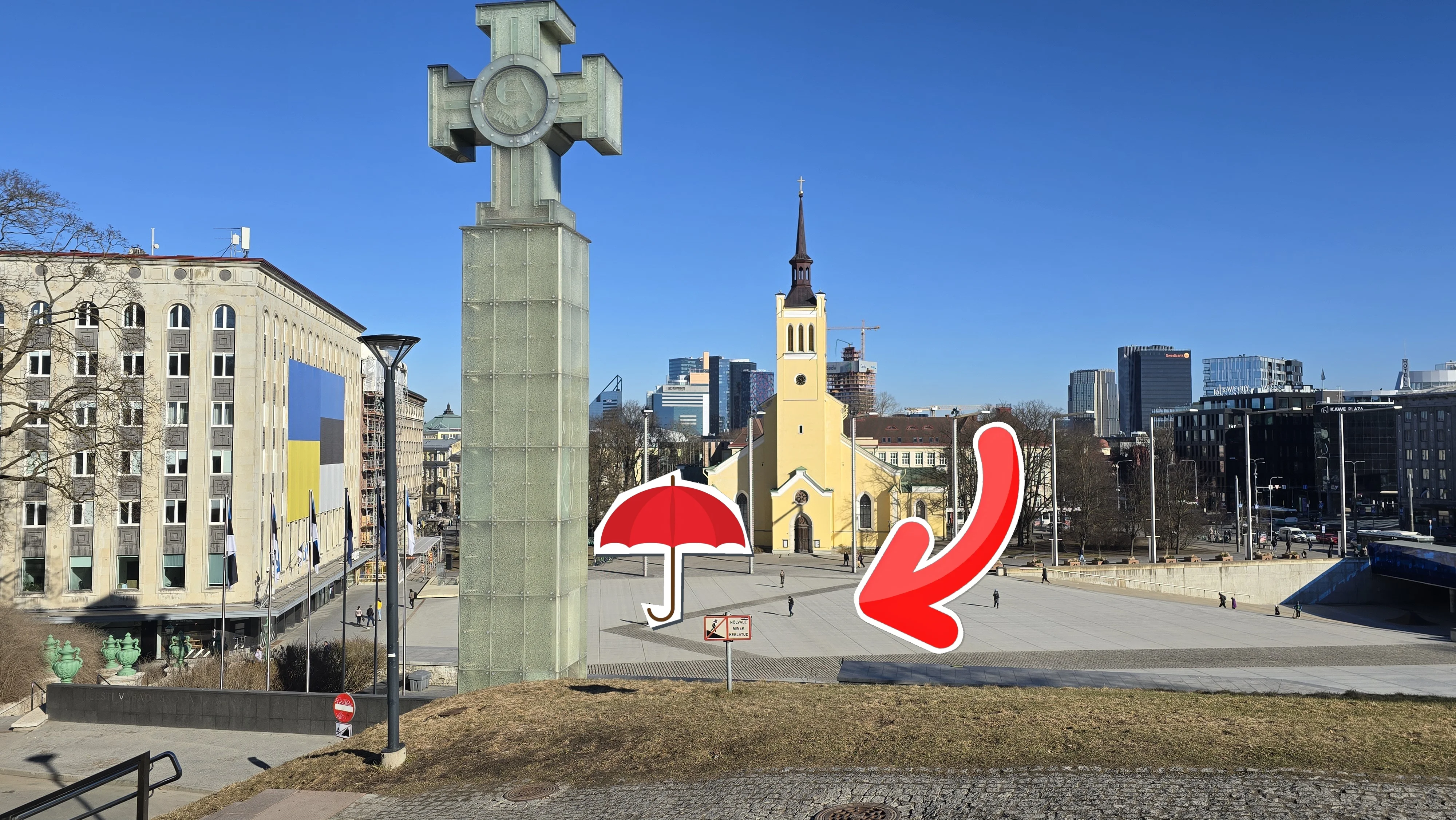 We will be holding a Red Umbrella, waiting in Freedom Square, near the Cross of Liberty. Meeting point as per photos. See you there!