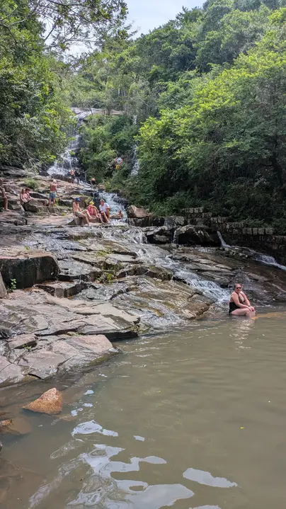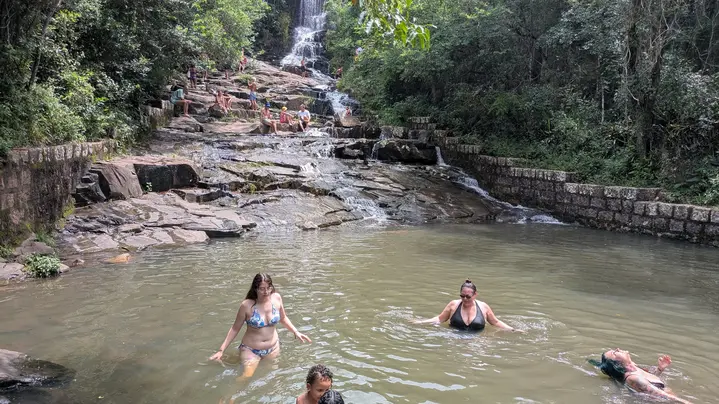 Una cascada en medio a la Mata Atlantica donde tenemos una piscina del agua corriente muy fresca y limpia.