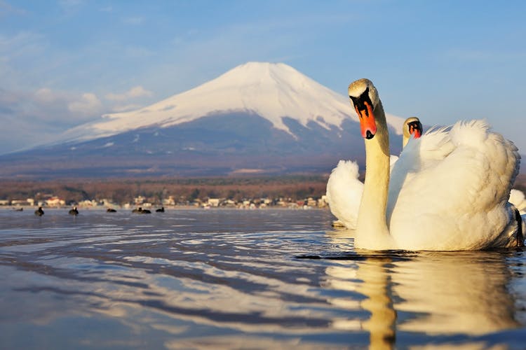 Next, visit Swan Lake, part of the Fuji Five Lakes. This peaceful location offers stunning photo opportunities of graceful swans gliding across the lake with Mt. Fuji.