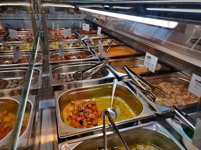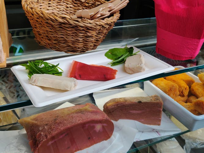 The tour begins with a selection of cured meats, cheeses, and the renowned porchetta. You will then taste natural wines from small, ethical Italian producers. You’ll continue with seasonal delights: from the freshest fish from the Tyrrhenian Sea to prepared dishes using local, innovative ingredients, including plant-based "cheeses" and deli cuts. You'll witness the art of handmade pasta in a show cooking demonstration and, to conclude, taste classic Roman street food: delicious arrosticini.
