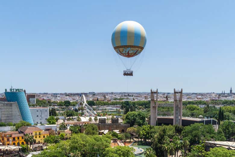 The Nao Vigia is a tethered balloon located in the Isla Mágica theme park near the Guadalquivir River, providing a safe and thrilling experience. Your ticket grants you a 10 to 15-minute ride to enjoy panoramic views of landmarks such as the Cathedral of Seville and the Giralda tower, along with the picturesque Murillo Gardens.