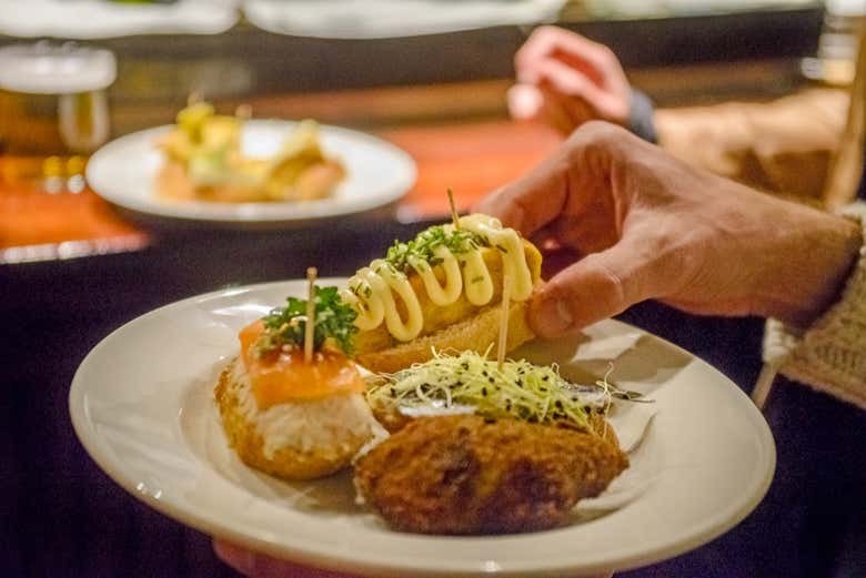 The tour features 3 designated stops where you'll taste a variety of these small dishes, including typical offerings such as Padron peppers, traditional mushrooms, ham and Iberian sausages, paired with wine, and meat cheeks with smashed potatoes along with wine.