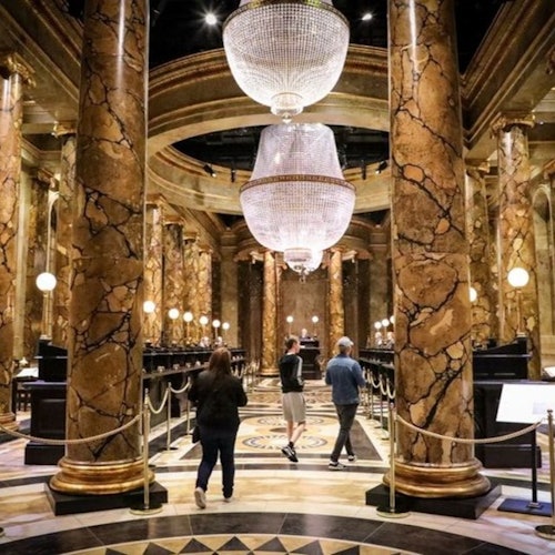 Wander through Diagon Alley's cobblestone streets, featuring famous shops like Ollivander's, the Weasleys' Wizard Wheezes, and Gringotts Wizarding Bank.