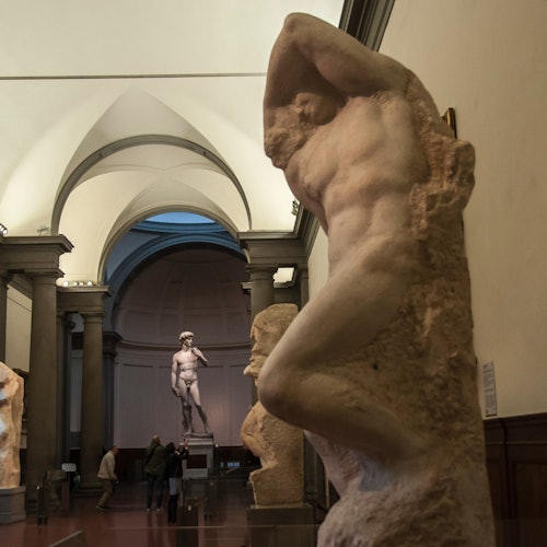 Discover Michelangelo's renowned masterpiece, the "David," along with other significant works like the Prigioni, S. Matteo, and the Pietà di Palestrina.